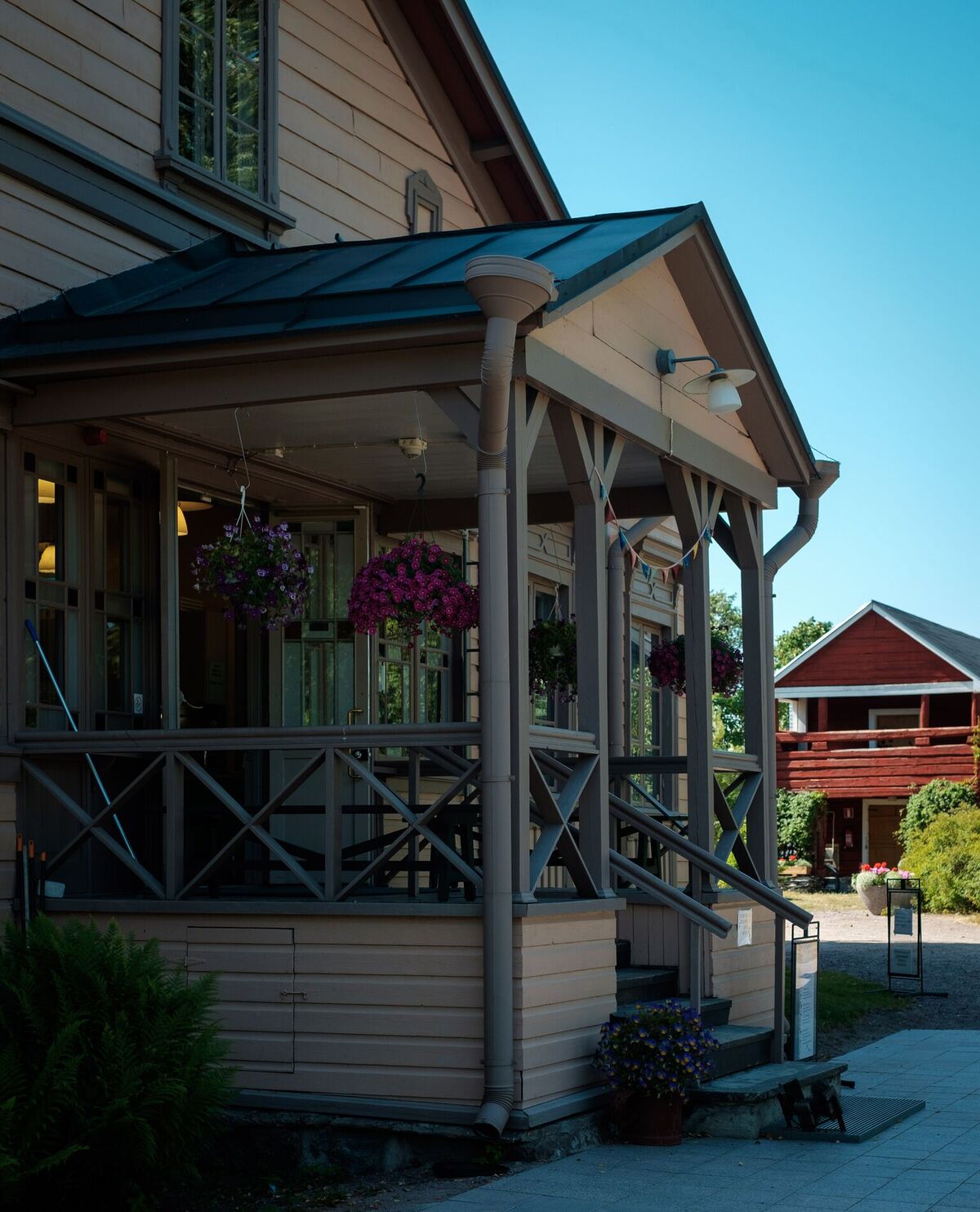 Kahvilalla on myös suuri terassi ja lisätilaa on tehty myös rakennuksen ulkopuolelle katoksen alle. Puiden varjossa on pöytä- ja tuoliryhmiä, joissa voi nauttia eväitä tai kahvilan herkkuja. Kahvilan kuuluisat jättikorvapuustit tuoksuvat jo lauttarantaan saakka. Kahvilassa on myynnissä pullan, kahvin ja juomien lisäksi myös muita herkkuja, täytettyjä leipiä, smootieita ja jäätelöä. Lounas on tarjolla kesäaikana tiistaista sunnuntaihin.