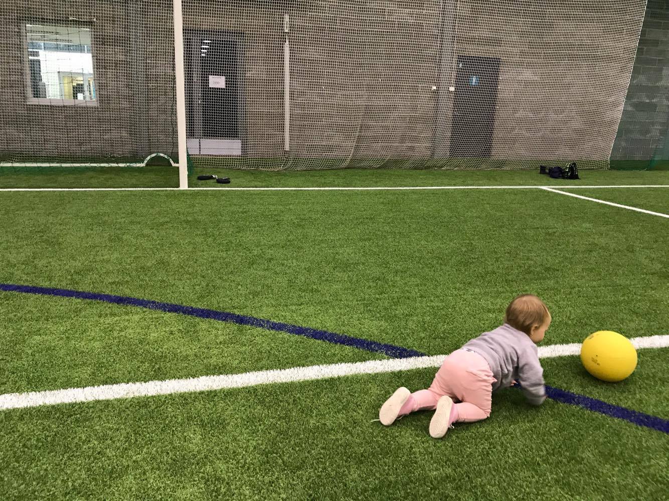 Perhepalloilussa Pallomyllyn tekonurmi on varattu pienten palloilijoiden käyttöön. Pehmeä alusta, valtavasti tilaa ja säkillinen erilaisia palloja antavat pienille tilaa touhuta, pelata ja harjoitella vaikka kävelyä. Perhepalloilussa lapset harjoittelevat oman aikuisen kanssa.[caption id=“attachment_1944” align=“aligncenter” width=“1024”]