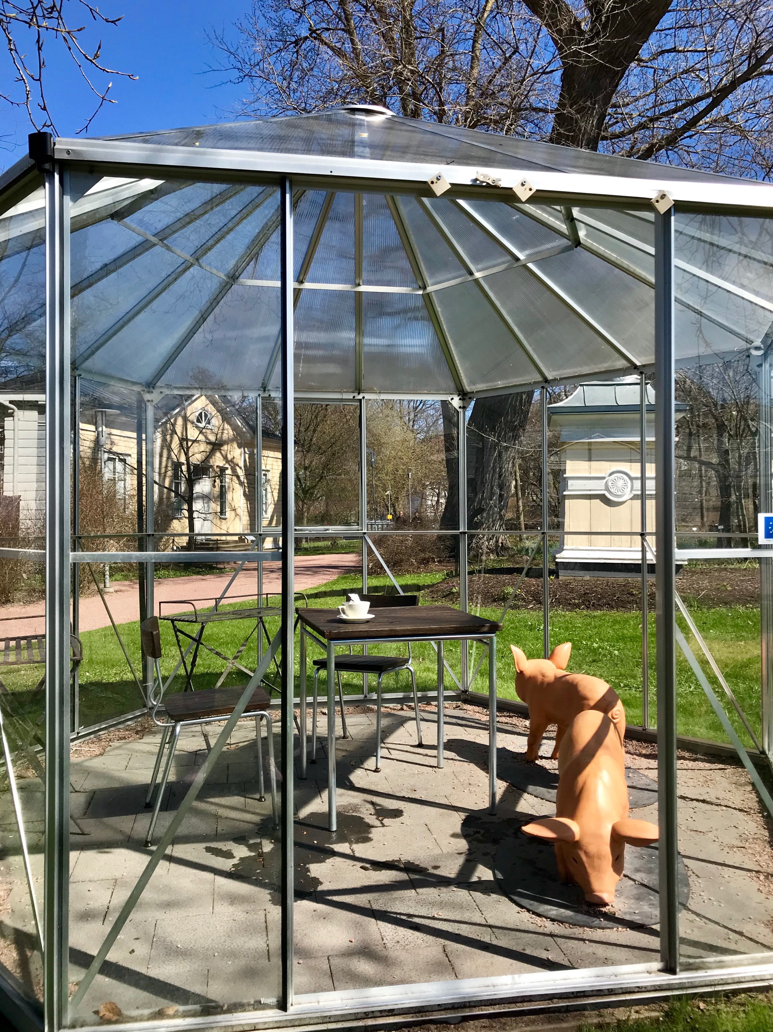 Astuessamme sisään puutarhan porttien sisäpuolelle tuntee tulleensa toiseen maailmaan: jo toukokuun alussa puistossa kukkii monenväriä kukkia, puissa on silmuja ja erilaisia kiemuraisia oksia. Museokaveri innostuu ulkopuutarhan erilaisia käytävistä ja käytävien reunakivistä ja taiteilee niitä pitkin kävellen läpi puutarhan etupihan. Myös pihalla oleva lasikasvihuone kiinnostaa, sillä siellä asusutelee kaksi pientä possua, tosin puisia sellaisia mutta juuri sopivan kokoisia lapsen makuun. Lasikasvihuoneessa on myös pöytä ja pari tuolia ja varmistamme vielä museon vahtimestarilta, että täällä voisi piipahtaa eväsretkellä ihan muutenkin. Vieressä, vaaleansinisessä sivurakennuksessa toimii Café Viola, joten eväitäkään ei tarvitse aina muistaa pakata mukaan. Puutarhan alueella, leikatulla nurmikolla saa syödä muutenkin omia eväitä, kunhan huolehtii puutarhan siisteydestä.
