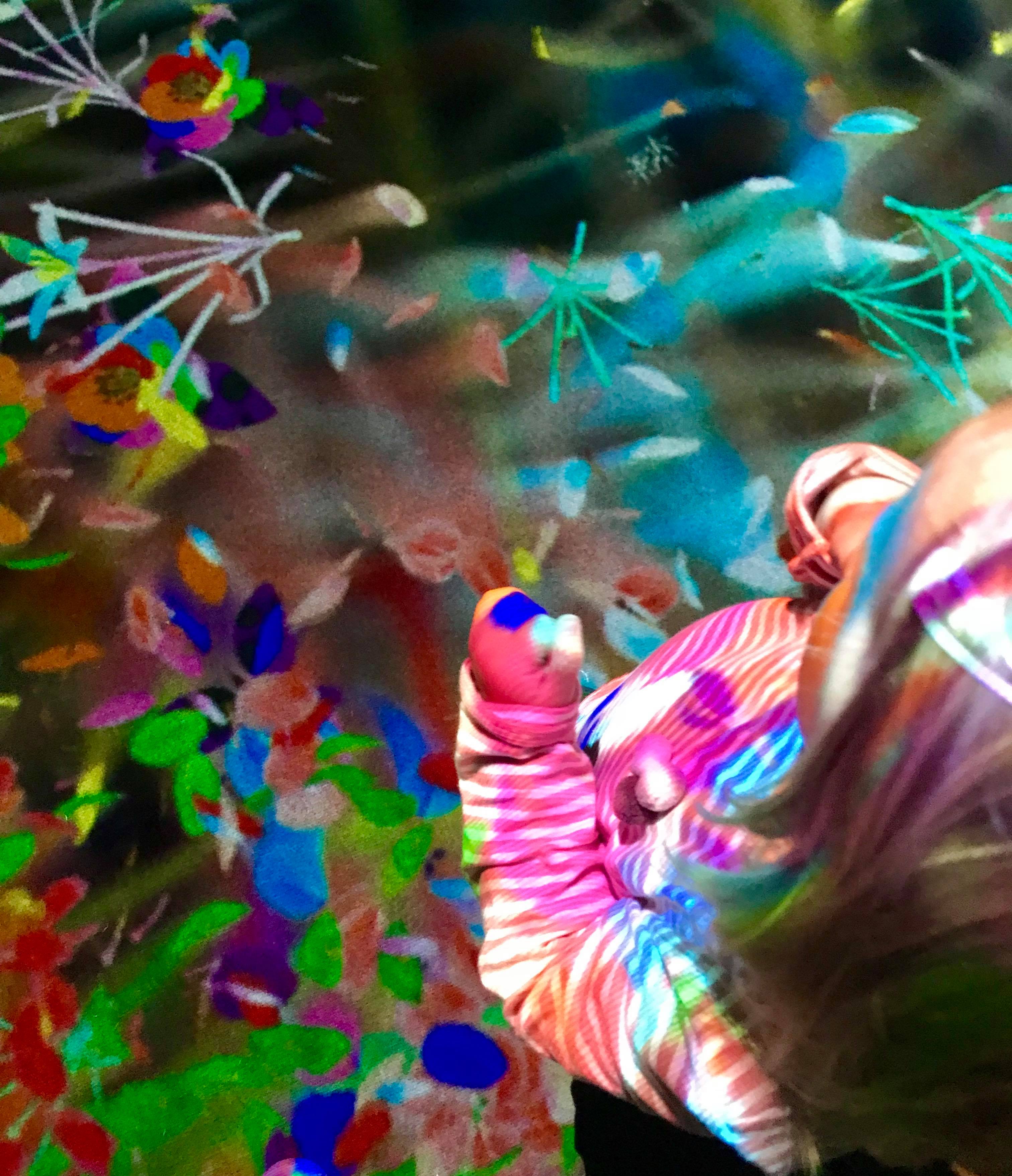TeamLabin näyttely tai taidekokemus paremminkin, on sukellus erilaisiin maailmoihin kuvan, äänen, valojen ja varjojen kautta. Kuin astuisi itse osaksi taideteosta. Näyttely on eri huoneissa, joista kaikki ovat pimeitä ja täynnä heijastavaa pintaa, joten näyttelytilaa on hankala hahmottaa. Paikalla on onneksi avaruustakeista tunnistettavia museo-oppaita, joilta saimme hyviä neuvoja ja opastusta. Osa tiloista ja maailmoista oli pienen museokaverin mielestä jännittäviä ja yhden teoshuoneen kohdalla varoitettiin hyvin vahvasti vilkkuvista valoista. Viihdyimme kuitenkin näyttelyssä, sillä värikkäiden kukkien ja eläinten valloittama suuri tila toimi mainiosti myös lapsen kanssa ja teki aikuisenkin onnelliseksi. Museokaveri hihkui onnesta yrittäessään ottaa kiinni lattiaan ilmestyviä kukkia ja jalkojemme välissä vipeltäviä liskoja. Paikallaan seisomonen sai kukkameren kasvamaan katsojan ympärille.