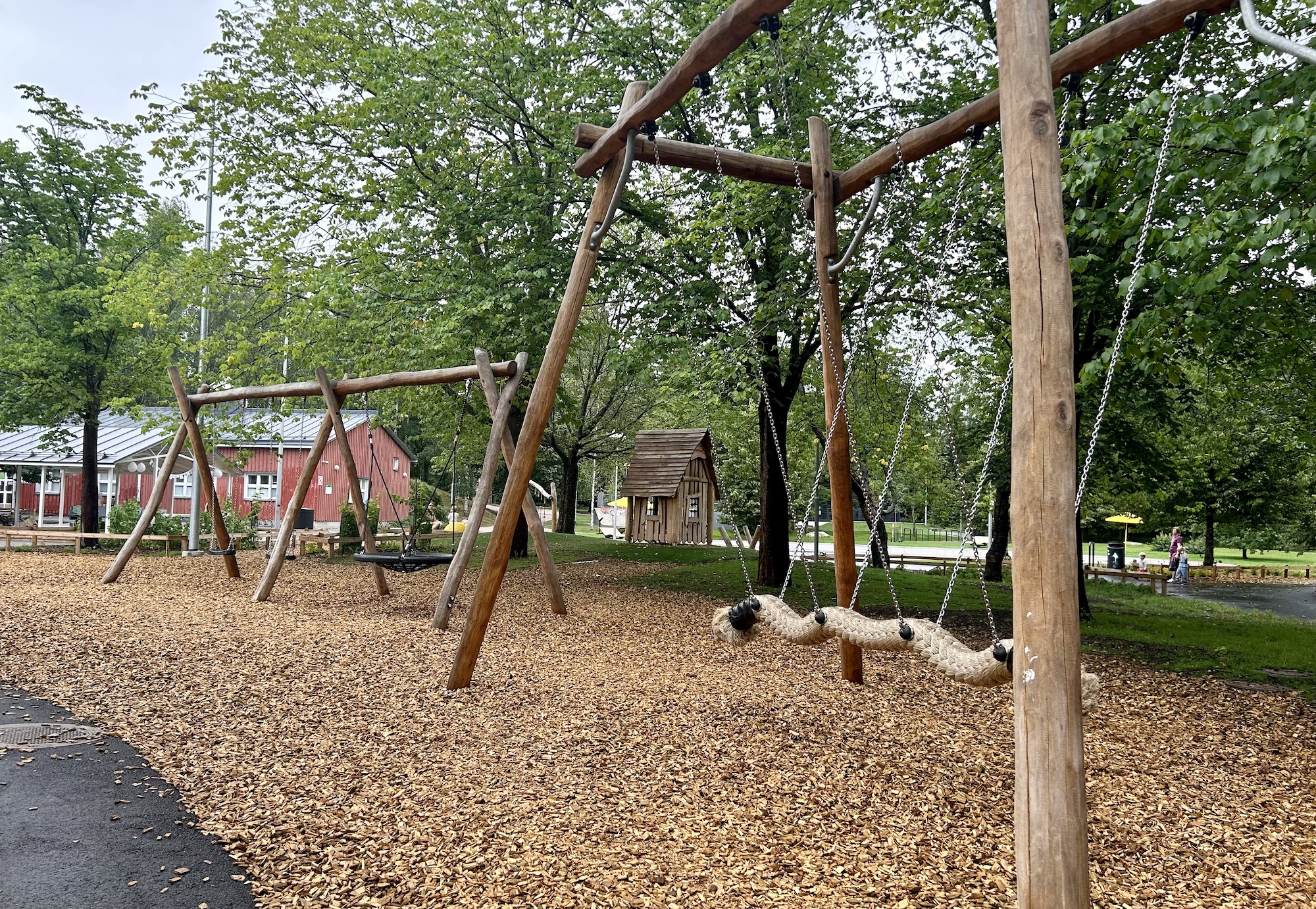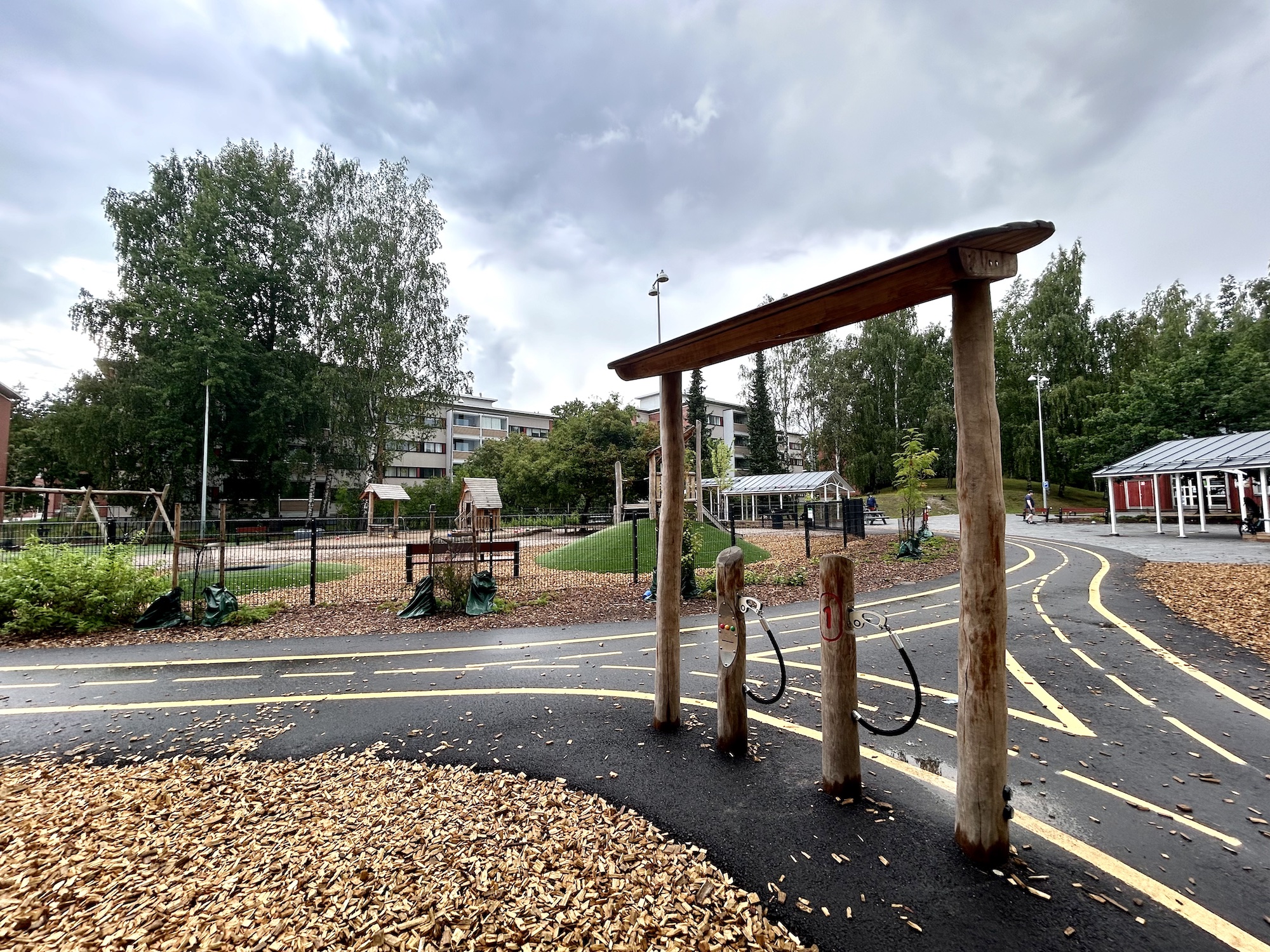 Eri toiminnallisuuden ovat tasapainossa: pienille on oma aidattu, todella monipuolinen alue, isommille sopivan haastava kiipeilyteline, erilaista keinuja, vaijeriliuku ja kahluuallas (joka on käytössä vain kesäkaudella puiston ollessa avoinna). Puiston toisella laidalla skeitti- ja skuuttipaikka, monitoimikenttä ja kuntoiluteline. Ja puiston sympaattisen juttu: oma tankkausasema pienille polkijoille leikkipuistoa kiertävän ajoradan varrella!