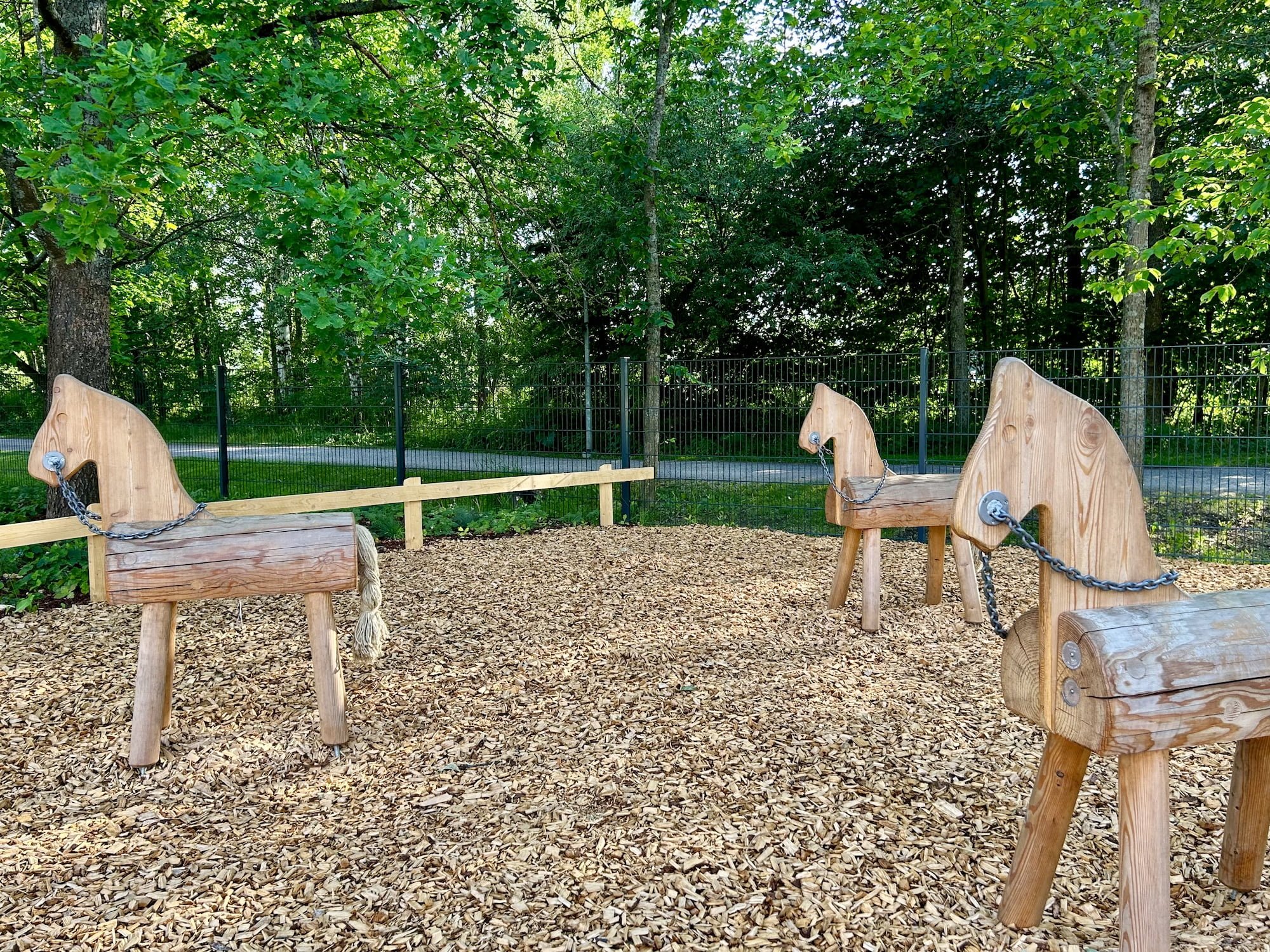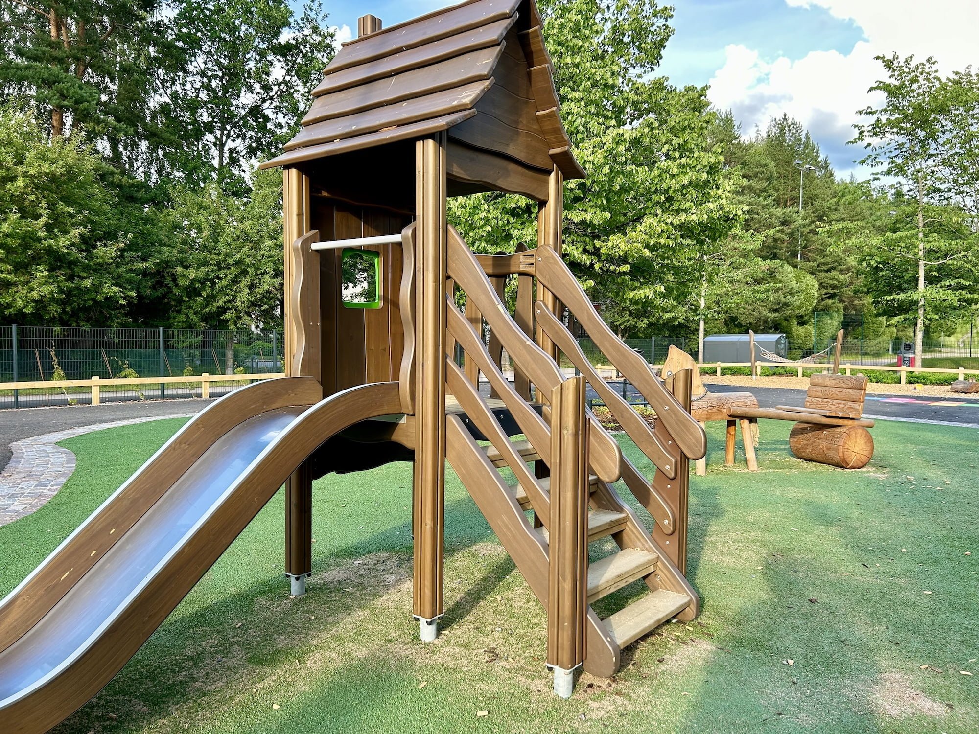 Kannelmäessä sijaitseva leikkipuisto Trumpetin piha-alue hohtaa vielä vierailuhetkellämme uutuuttaan. Uudistustyö näyttää olevan ainakin yhden keinun ja mahdollisesti myös karusellin vinoudesta päätellen vielä osin kesken, mutta onneksi muuten puisto näyttää hienolta ja lämmin kesäilta on houkutellut monipuoliselle pihalla jo paljon leikkijöitä. Nimestään huolimatta leikkipuisto Trumpetin pihaa ei ole rakennettu soitin-teeman ympärille, vaan tässä leikkipuistossa seikkailevat kotieläimet. Eläinten jäljet leikkipuistojen porteilla johdattavat puisten hevosten, possujen, lehmien ja lampaiden luokse, kiipeilemään, keinumaan, laskemaan liukumäkeä sekä hurjaan vaijeriliukuun. Leikkipuisto Trumpetin leikkialue on aidattu, pienten leikkialuetta ei ole erotettu muusta pihasta.