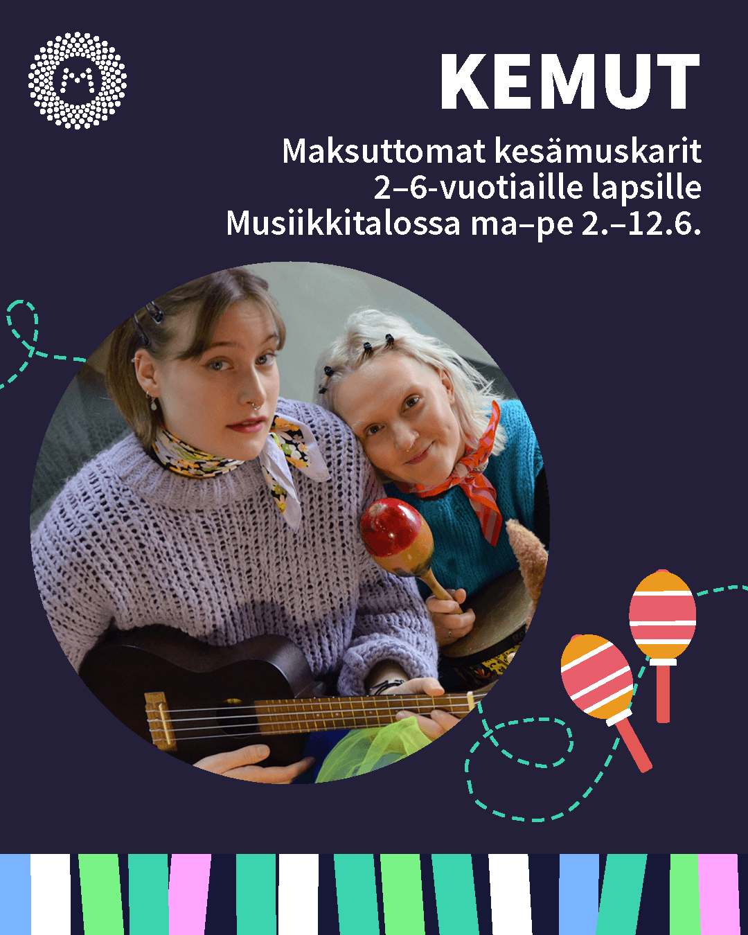 KEMUT kesämuskareissa lauletaan, soitetaan, liikutaan ja leikitään. Muskarit tarjoavat elämyksiä sekä iloa ja tukevat lasten luovuutta, sosiaalisia taitoja sekä musiikillista kehitystä. Musiikkitalon muskarihetket sopivat ensikosketukseksi musiikkiin tai jo muskarikokemusta omaaville lapsille. Kesämuskareita ohjaavat Sibelius-Akatemian opiskelijat Anna ja Taina. Kesämuskareita järjestetään Musiikkitalon Alalämpiössä arkipäivisin 2.–12. kesäkuuta. Aamupäivän muskarituokiot on suunnattu 2–3-vuotiaille ja iltapäivä 4–6-vuotiaille.