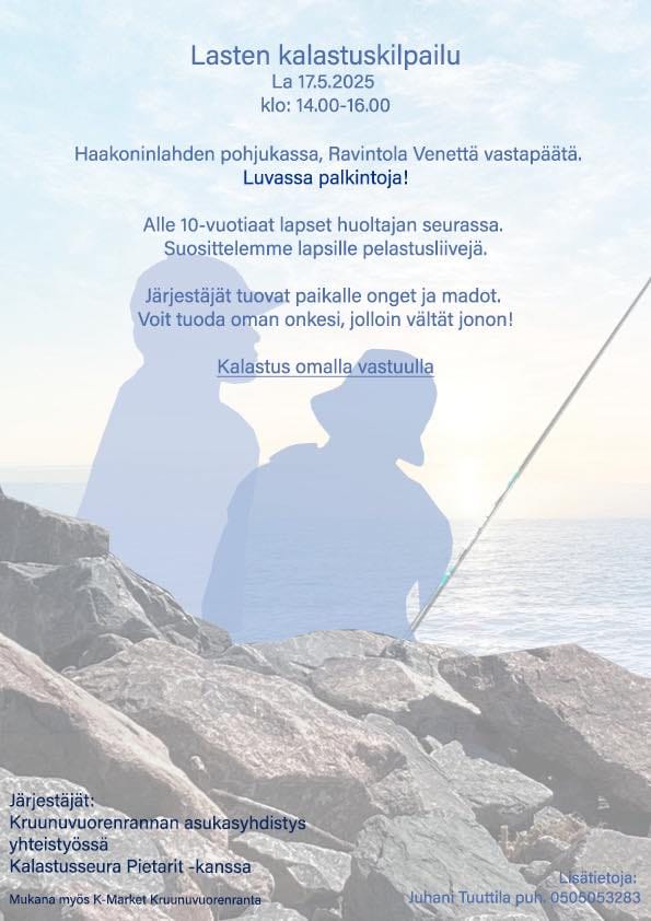 - Lasten kalatuskilpailu Kruunuvuorenrannassa Saaristolaivastonkadun ja Koirasaarentien risteksen rannassa lauantaina klo 14-16. Lisätiedot alla olevassa kuvassa. Vapaa pääsy.