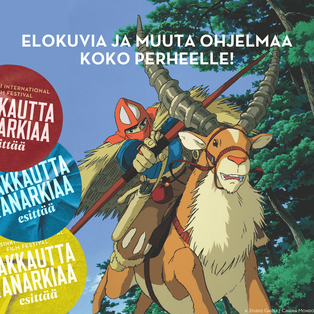 Rakkautta & Anarkiaa -festivaali juhlii sunnuntaina 18.5. Studio Ghiblin 40-vuotissynttäreitä Bio Rex Lasipalatsissa koko päivän! Päivän ohjelmassa on elokuvanäytöksiä sekä runsaasti maksutonta oheisohjelmaa kaikenikäisille: muun muassa Studio Ghibli -teemainen aarteenmetsästys, Museo Leikin lego-työpaja, Ghibli-aiheisia palapelejä ja värityskuvia sekä Shumiconin origamityöpaja. Elokuvaohjelmistossa nähdään suomeksi puhuttuna ihastuttava Ponyo rantakalliolla sekä suomeksi tekstitettynä Ghibli-suosikit Henkien kätkemä, Liikkuva linna ja Prinsessa Mononoke. Elokuvaliput (13€/6€ alle 10-vuotiaille) ovat myynnissä osoitteessa hiff.fi!