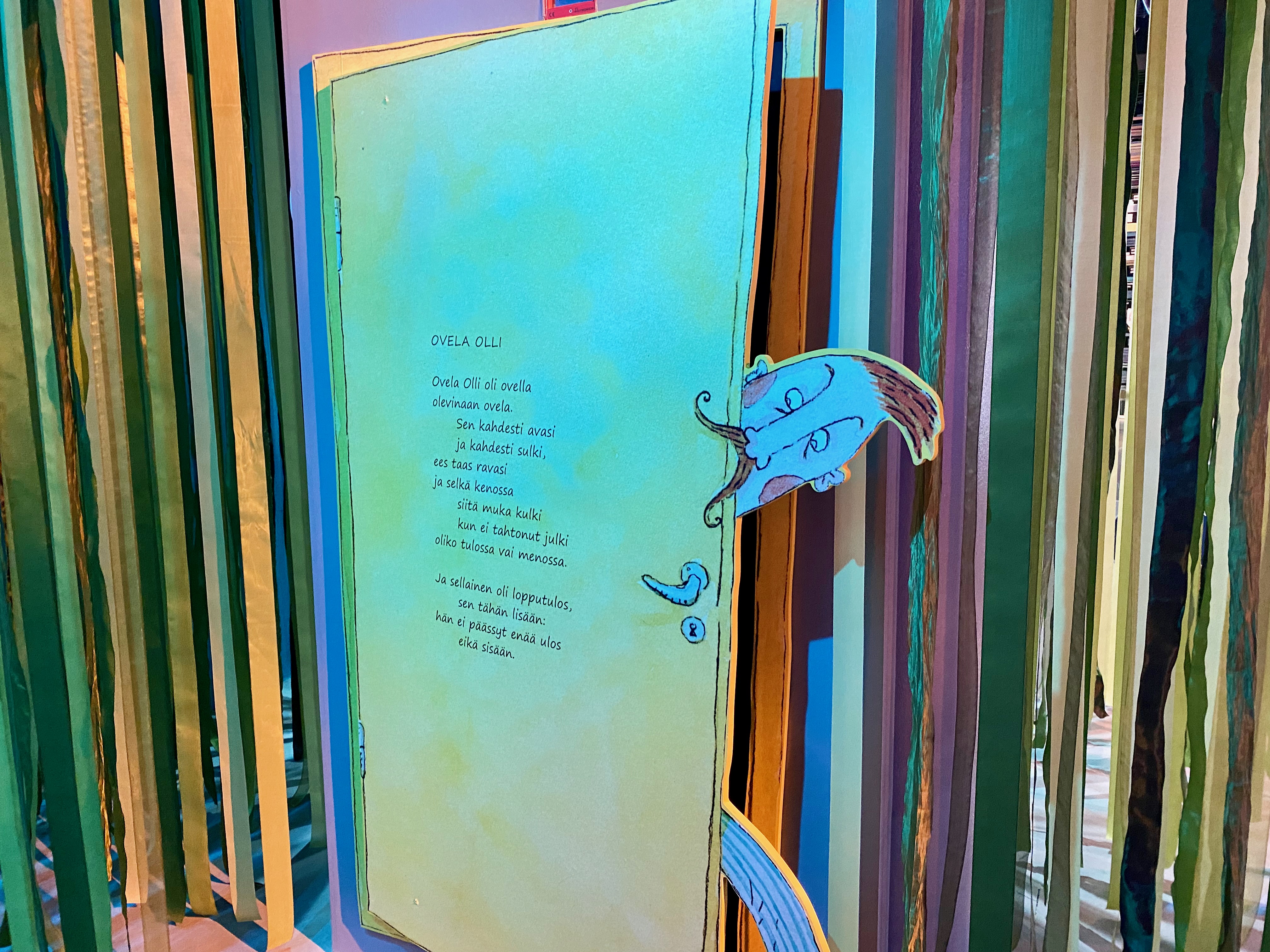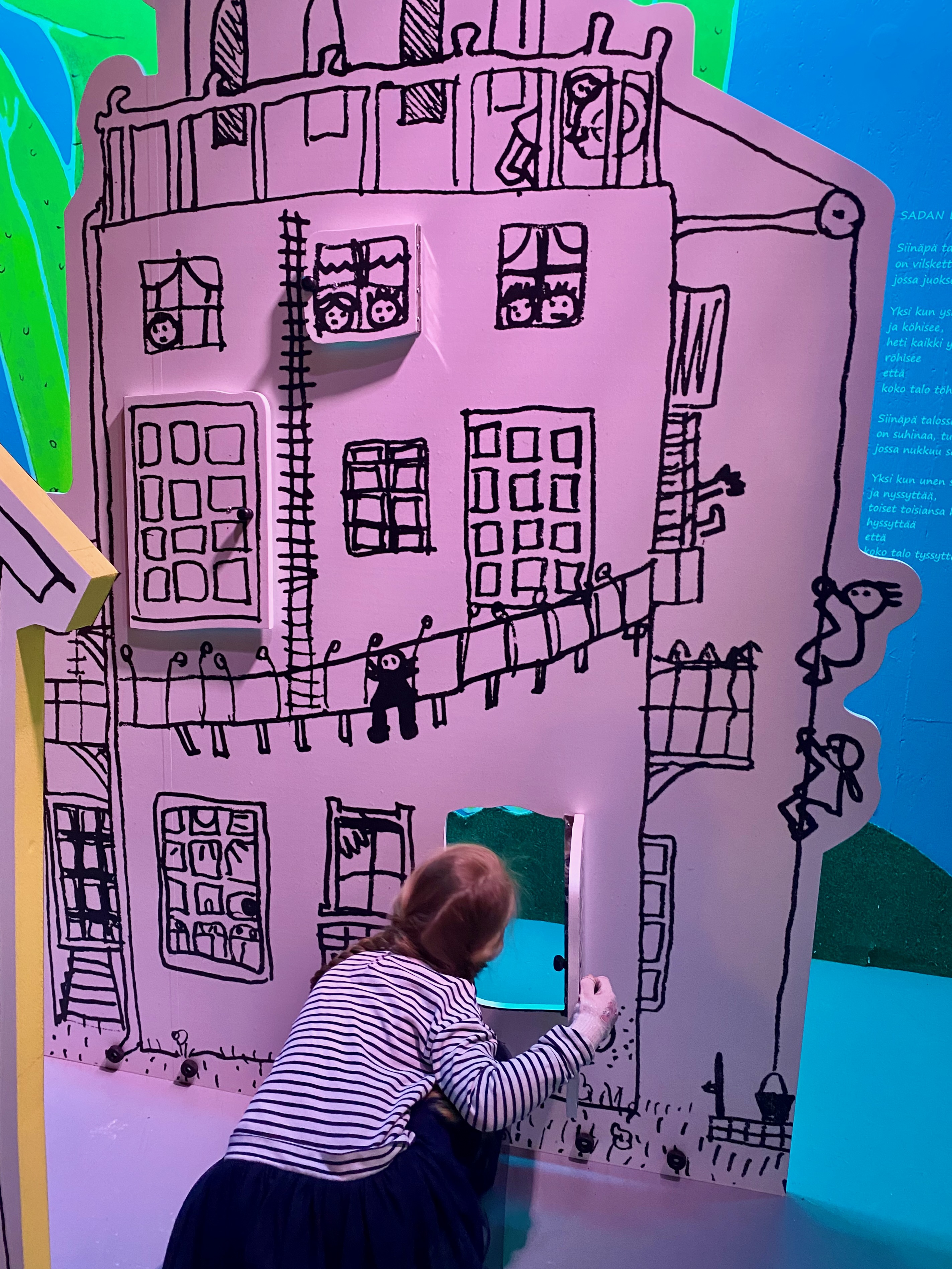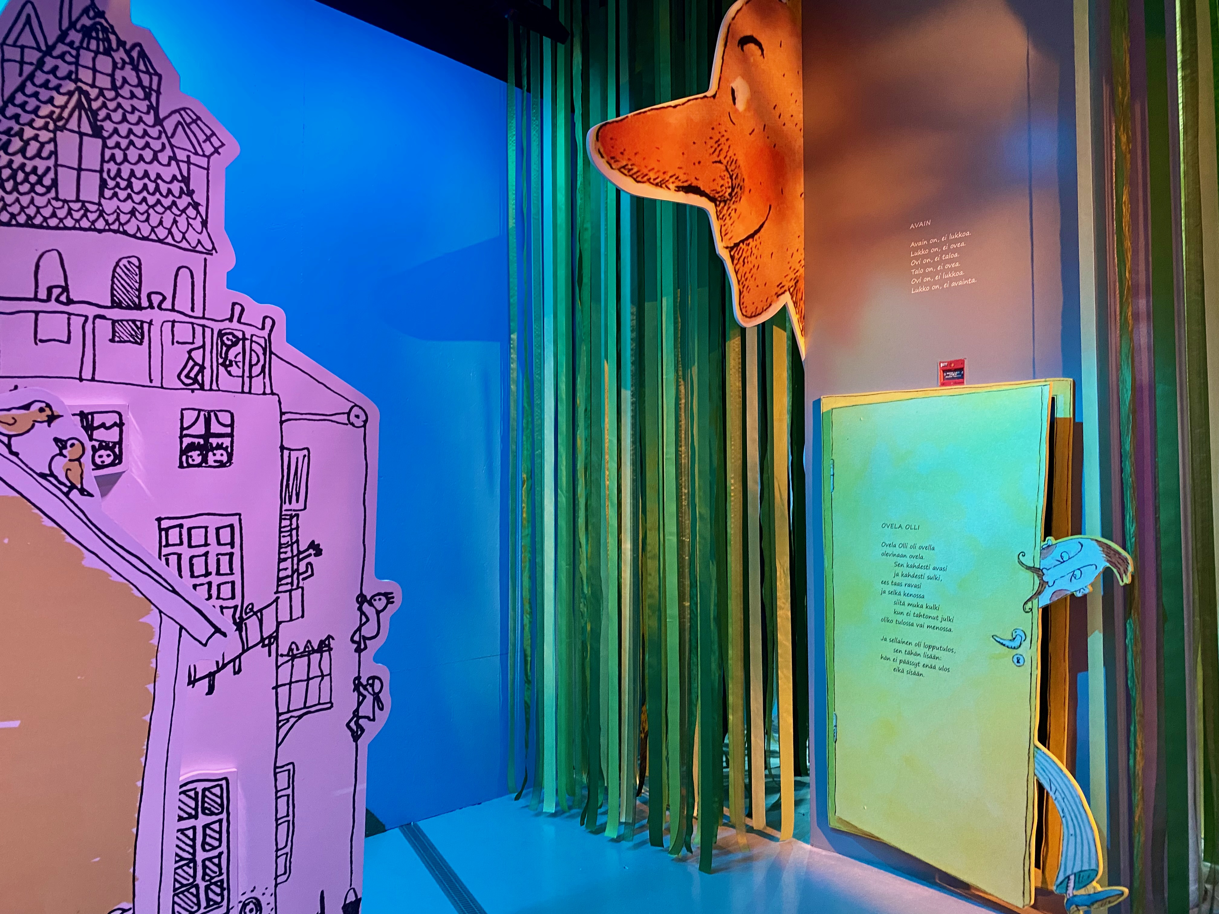 Ensivaikutelma sisään Päivälehden museoon astuessa on paljon upeita värejä, kiinnostavia hahmoja ja muotoja, katosta roikkuvia lankapuhelinten luureja ja näyttelyn läpi kiemurtelava polku. Museokaverikin kysyi heti aulassa mikä ihmeen satumaa tämä on. Ja toden totta, tupsahdimme keskellä Tiitiäisen, Lillukka Lillin, Ovela Ollin, Kissa Krumeluun, Metsähiisin, Villen sekä Vallen ja kymmenien muiden Kirsi Kunnaksen loruista ja runoista tuttujen hahmojen maailmaa. Näyttely oli juuri hetki ennen vierailuamme avattu ensimmäisen kerran yleisölle ja seuralaiseni sai aivan sattumalta kunnian olla Tiitiäisen aika -näyttelyn ensimmäiset lapsivieras.