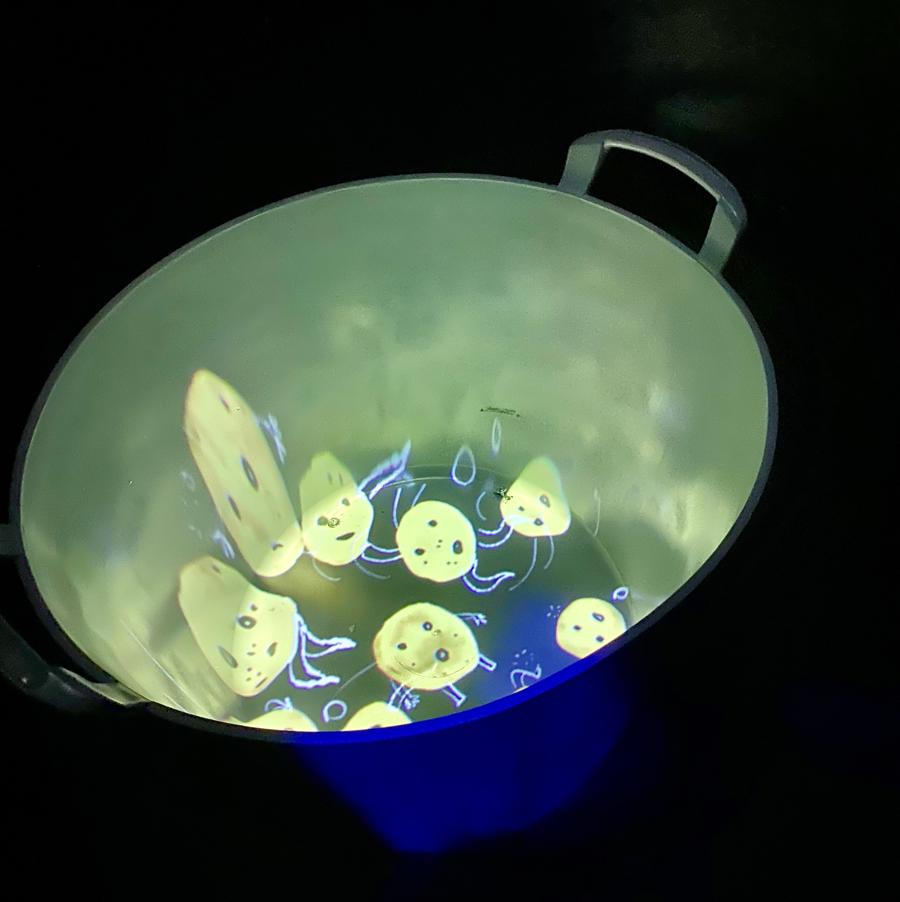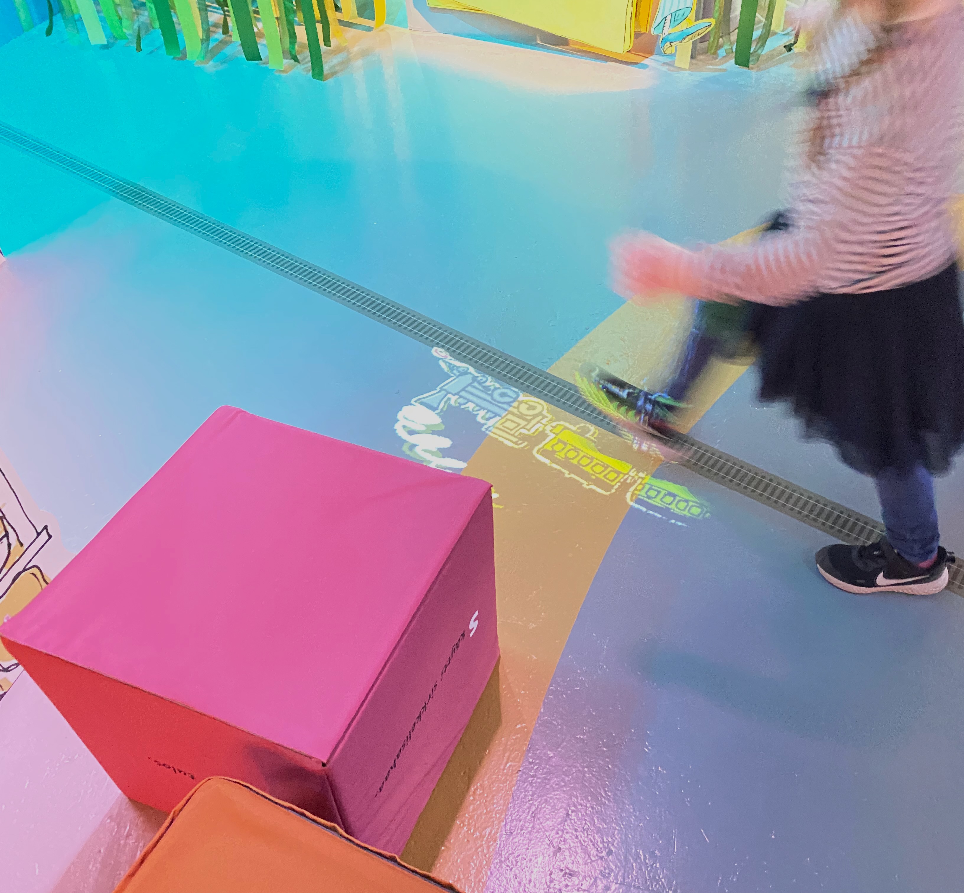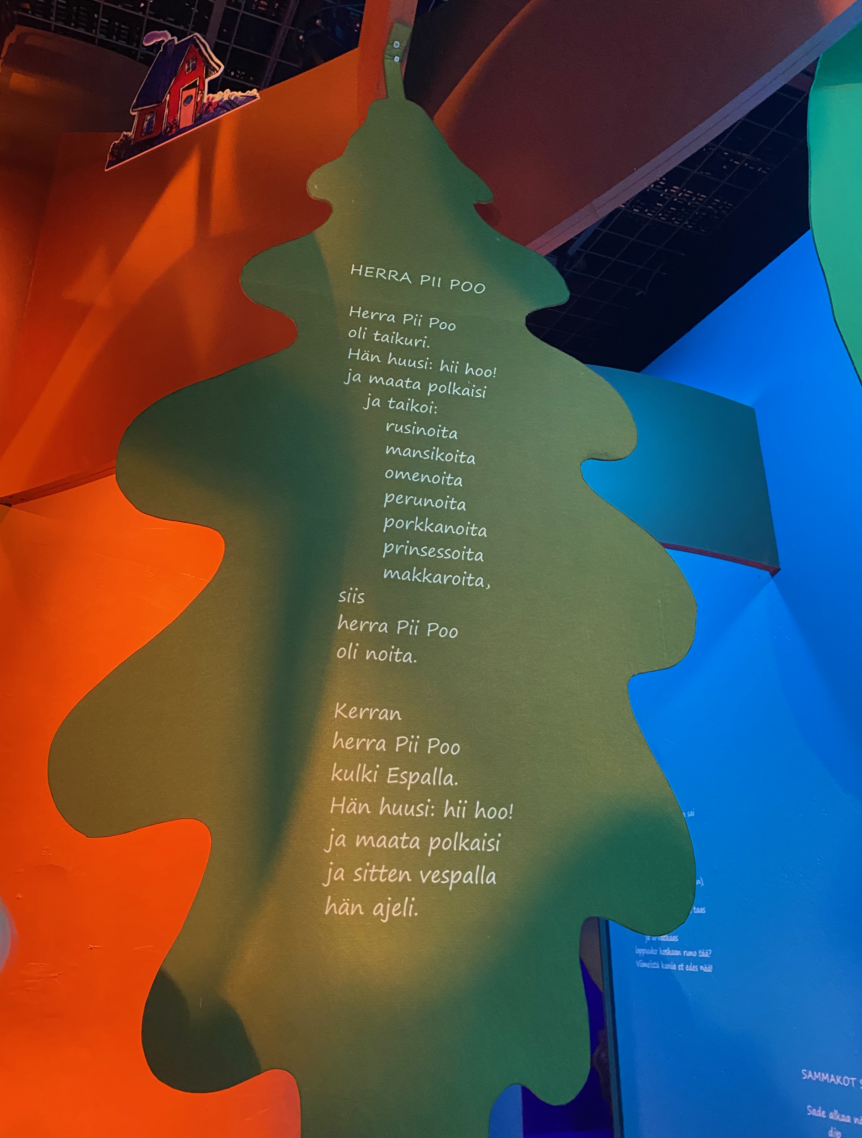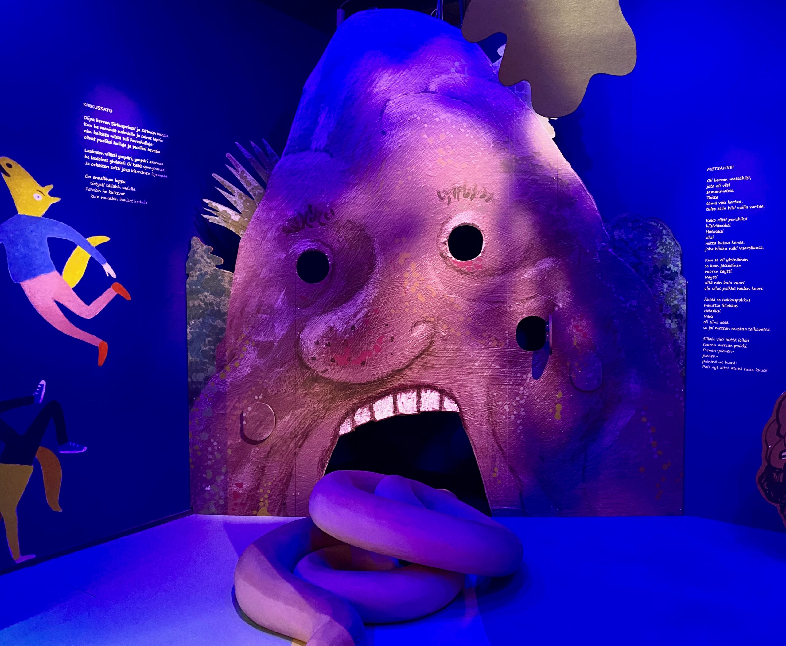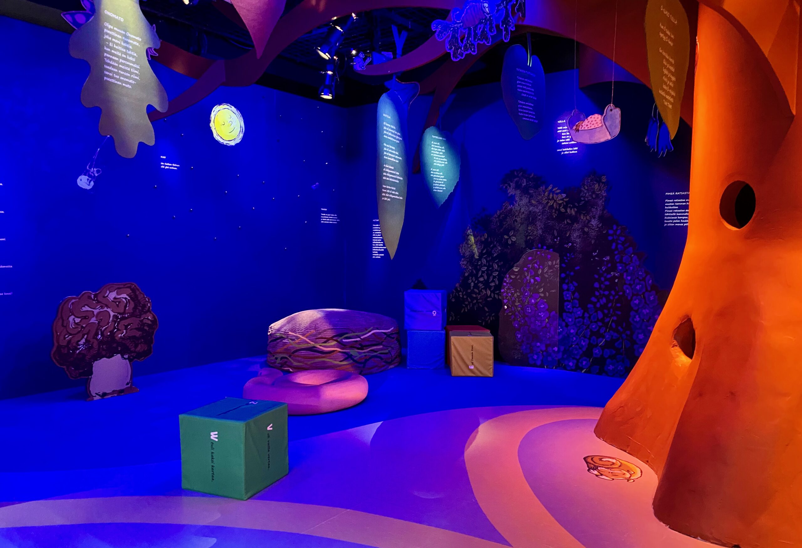 Kestää hetken tajuta näyttelyn idea ja aluksi vain harhailemme runoja lukien, mutta hetken päästä näyttelytilan läpi raiteita pitkin puksuttava juna herättää pienen näyttelyvieraan mielenkiinnon ja alkaa projektoreilla heijastettavien satuhahmojen etsiminen ja hyppy sadun maailmaan. Sen jälkeen pieni näyttelyvieras uskaltautuu kurkistamaan myös Metsähiisin avoinna ammottavaan suuhun ja ryömimään puunrungon sisään, jossa kattilassa kiehuvat ja puhisevat perunat. Sitten kurkistellaan salaisen oven taakse ja seikkailaan pitkin polkua kohti hymyilevää kuuta ja seinällä kiitävää rakettia.