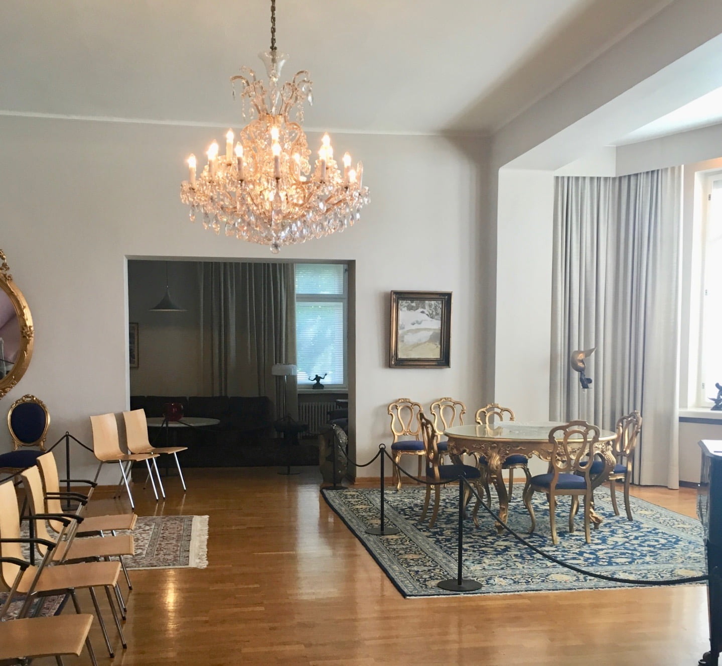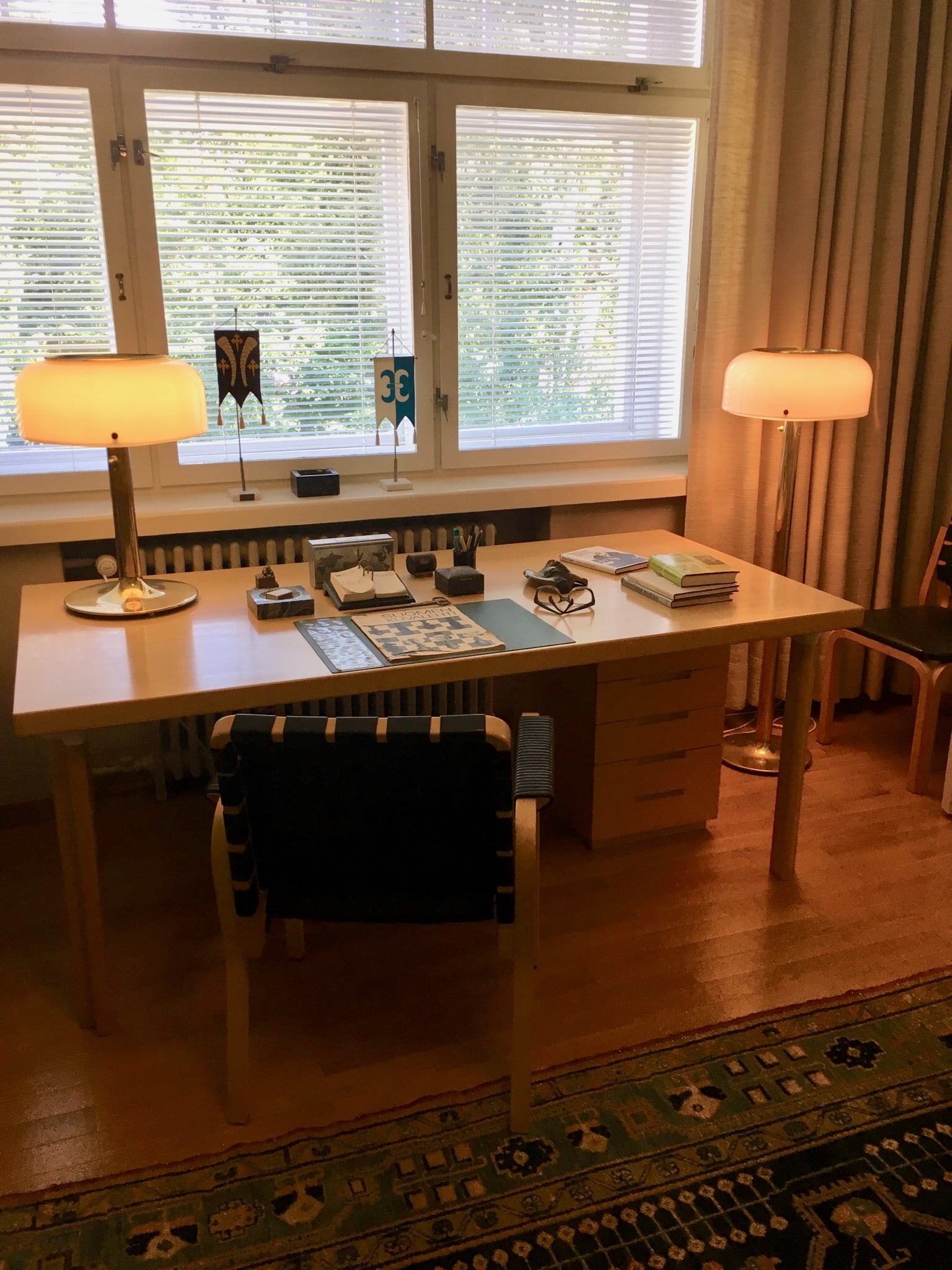Entä Tamminiemi ja lapset? Kotimuseo ei tarjoa mitään varsinaisia lasten aktiviteettejä, mutta se oli lopulta myös lasten mieleen. Museokaveria viehätti erityisesti tunne siitä, että olisimme vain kylässä. Ihailimme kristallikruunuja, kylpyammetta ja pohdimme kuka täällä asui, mitä ihmeellisiä laitteita presidentin työpöydällä oli ja ihastelimme Kekkosen hirsisaunan uima-allasta, joka oppaan mukaan oli myös presidentin lastenlasten mieleen - "ainoa luksusasia koko paikassa". Ja niinhän se onkin, Tamminiemi on koti, joka on toki nähnyt myös tärkeitä vieraita ja kuullut merkittäviä keskusteluja. Sukkasillaan hipsiminen presidenttien jalanjäljissä ei ole lainkaan huono saavutus jo nuorella iällä!